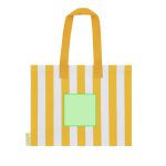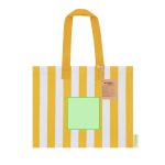 Sac en coton recyclé de 310 g/m2. Longues poignées de 70 cm avec renfort, finition et gousset cousus à la base et sur les côtés. Logo sur l’étiquette latérale et résistance jusqu’à 10 kg de poids. Avec un motif de bandes verticales blanches entrecoupées de couleurs.