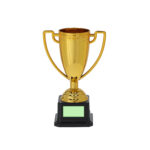 Trophée avec une finition élégante brillante de couleur dorée, conçu avec de larges poignées et une base de couleur noire pour une touche distinctive.