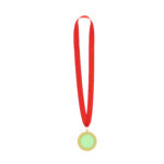 Médaille en métal avec une finition dorée en relief de 7 cm de diamètre. Avec un ruban en polyester de couleur rouge, un anneau métallique assorti et spécialement conçu pour le marquage au laser.