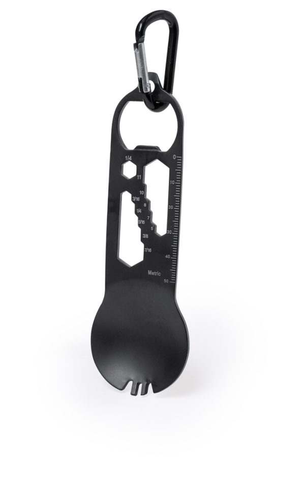 Complet multi-outils avec 16 fonctions en acier inox. Comprend : mousqueton pour un transport facile, fonction tournevis à plat, décapsuleur, règle jusqu’à 5 cm sur un côté, partie centrale pour les écrous de 11 dimensions différentes (de 1/4 à 11) et pratique cuillère à dents pour l’utilisation de la fourchette. Présentée dans un sac individuel.