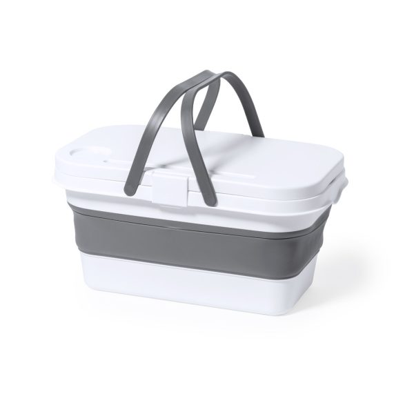 Panier de pique-nique pliable et multifonctionnel. Fabriqué en matériau PP résistant avec une finition blanche, d’une capacité de 16 litres. Couvercle transformable en table au moyen de 2 pieds rabattables, avec supports pour smartphones ou tablettes et bouteille d’eau intégrée. Comprend 2 poignées de transport grises pliantes. Une fois plié il prend peu de place, idéal pour un rangement facile.