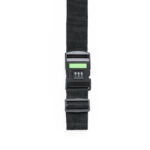 Ruban à valise en polyester résistant. Ceinture de valise pratique avec fermeture par clic et mot de passe à 3 chiffres, finition noire élégante et de longueur 200cm. Présenté dans un sac individuel en papier recyclé.