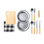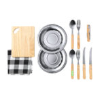 Set de pique-nique original avec 2 services. Présenté dans une housse coton résistante avec une finition naturelle, avec une fermeture à glissière et une poignée de transport. Intérieur renforcé, avec compartiments pour différents accessoires. Contenu: 2 cuillères, 2 couteaux et 2 fourchettes en acier inoxydable avec manches en bois naturel 2 plaques en acier inoxydable de 19,5 cm de diamètre. 2 serviettes en tissu de 30 x 30 cm. Avec un design rétro dans un motif à carreaux et dans une combinaison de tons noirs, gris et blancs. Tire-bouchon en acier inoxydable, avec couteau intégré et manche en bois naturel Planche à découper et de présentation de 15 x 15 cm, en bois naturel et avec manche découpé.