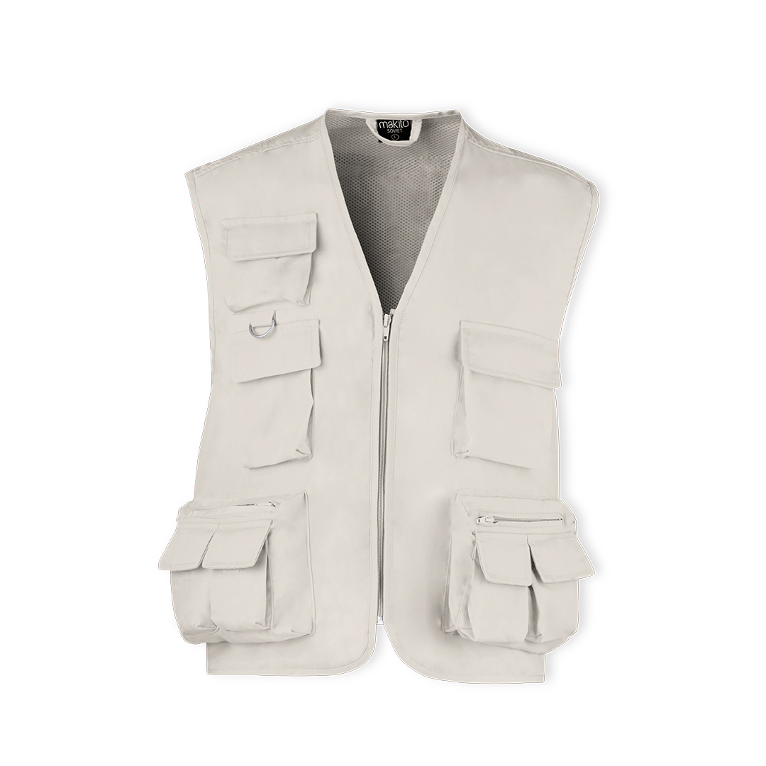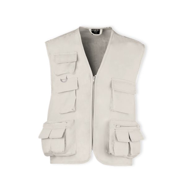 Gilet sans manches en mélange de coton et polyester résistant. Coloris variés. Fermeture principale à zip, nombreuses poches sur le devant et les côtés et anneau métallique sur la partie supérieure du devant. Poches de grande contenance avec fermeture velcro. Disponible en tailles L, XL, XXL.