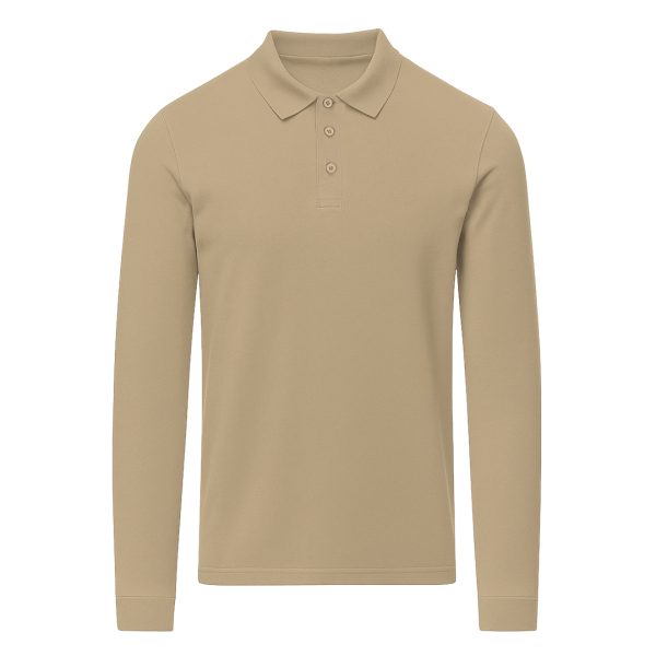 Polo unisexe à manches longues en tissu piqué. Col et poignets en maille côtelée 1×1 avec élasthanne pour un meilleur ajustement et confort. Patte de boutonnage à trois boutons ton sur ton et bande de propreté renforcée au col.