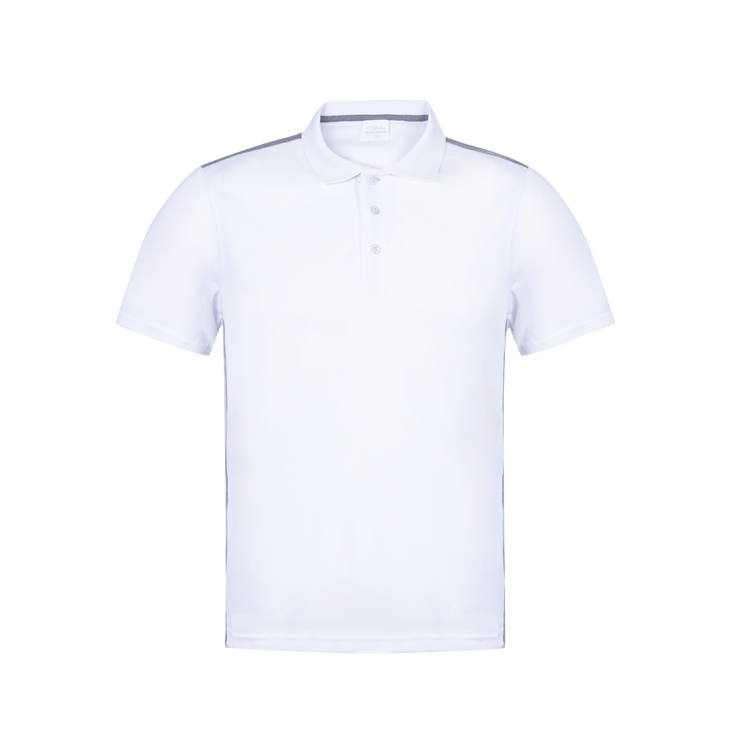 Polo technique pour adulte en polyester respirant 180g/m2. Design bicolore, avec le corps en blanc et les détails en gris. Disponible dans les tailles S, M, L, XL, XXL. Couleur blanche spécialement fabriquée pour l’impression par sublimation.