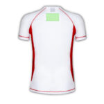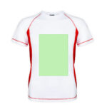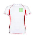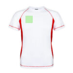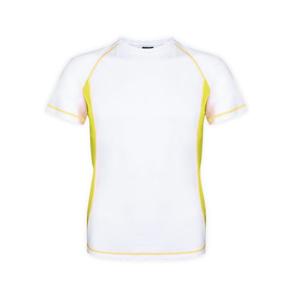 T-shirt technique pour adultes en 100% polyester respirant 135g/m2. Blanc avec coutures de renfort et côtés en couleurs vives. Disponible en tailles S, M, L, XL, XXL.