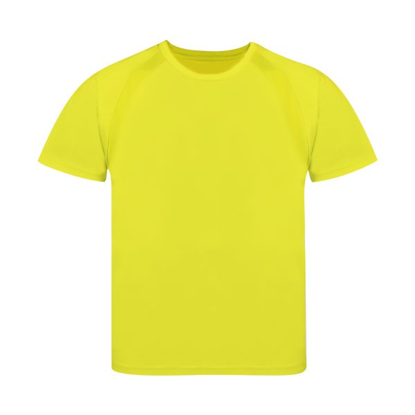 T-shirt technique pour enfant en matériau 100% polyester respirant 135g/m2. Avec manche Ranglán, col rond et bandes frontales et latérales en tissu respirant microperforé. Disponible en tailles 4-5, 6-8, 10-12.