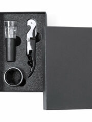 Complet set de vin à la finition noire sobre, présenté dans un étui individuel avec intérieur en mousse découpée et housse de protection blanche. Inclus un bouchon anti-goutte, un tire-bouchon en acier inoxydable et un bouchon de pompe à vide. Personnalisations possibles :TAMPOGRAPHIE E