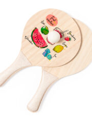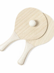 Paire de raquettes de plage de la ligne nature. Fabriqué en bois, avec manche renforcé en canne de blé. Présenté dans un sac en grille et avec une boule de canne de blé. Distinctif sur la poignée. Personnalisations possibles :SÉRIGRAPHIE G