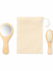 Ensemble miroir et brosse en bois naturel. Présenté dans une housse coton, avec fermeture à cordon Personnalisations possibles :SÉRIGRAPHIE F