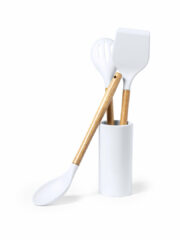 Set de cuisine 3 pièces, avec manche en bois d’acacia naturel et accessoires en silicone. Comprend une cuillère, une pagaie et une cuillère à fentes, avec une base en céramique assortie. Présentation en boîte individuelle de conception kraft. Personnalisations possibles :SÉRIGRAPHIE CIRCULAIRE F