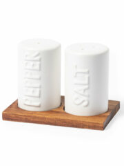 Ensemble de salières et poivrières blanches et en céramique. Comprend une base en bois d’acacia naturel, découpée pour s’adapter aux salières et poivrières. Présentation en boîte individuelle de conception kraft. Personnalisations possibles :GRAVURE LASER 1