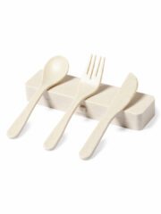 Set couverts – Ensemble de 3 couverts. Fabriqué en bambou, comprenant une fourchette, une cuillère et un couteau. Présentés dans une pochette en coton avec une fermeture pratique. Personnalisations possibles :SÉRIGRAPHIE G