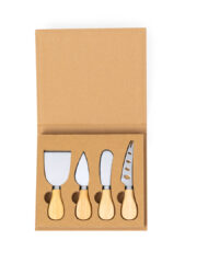 Ensemble de fromages en bois. Ustensiles en acier inox et manche en bois, avec quatre modèles différents : pour les fromages durs, les fromages mous, les fromages semi-durs et les fromages en morceaux. Présentés dans un étui original en carton recyclé, avec intérieur découpé pour chaque accessoire. Personnalisations possibles :SÉRIGRAPHIE F