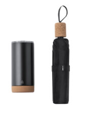 Set premium élégant comprenant : Gobelet thermique à double paroi en acier inox recyclé et 550 ml de capacité, avec finition noir mat élégante. Socle en liège, avec couvercle pressurisé et doseur. Il est idéal pour votre bureau, table ou toute autre surface où vous pouvez tranquillement savourer votre boisson préférée. Parapluie pliant noir de 98cm de diamètre. En matériau, mettez 190T RPET et manche en liège. Ouverture manuelle, avec système anti-vent et tiges en fibre de verre. Balise RPET distinctive. Set présenté en étui individuel de finition mat, avec découpage intérieur pour chacun des éléments du set. Le matériau RPET est fabriqué à partir de plastique recyclé, ce qui encourage la réutilisation des déchets plastiques et contribue à la durabilité de la planète. Personnalisations possibles :SÉRIGRAPHIE PARAPLUIE G