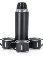 Ensemble de bouteille thermos et 3 tasses en acier inoxydable. Thermos double paroi d’une capacité de 420 ml, assurant une meilleure conservation de la température plus longtemps, avec distributeur sécurisé. Tasses de 140 ml à vis ajustable dans un design noir élégant, idéales pour déguster une boisson chaude ou froide, à tout moment, n’importe où. Présenté dans un élégant étui noir. Personnalisations possibles :SÉRIGRAPHIE CIRCULAIRE F