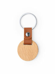 Porte-clés de la ligne Nature en bois naturel, avec bracelet en similicuir marron d’origine et rivet chromé. Disponible en modèles rectangulaires et circulaires. Personnalisations possibles :GRAVURE LASER 1