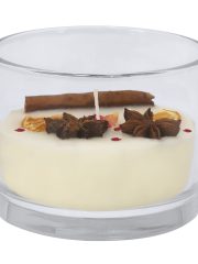 Bougie aromatique à base de cire végétale au parfum de cannelle et dagrumes. Ornée sur le dessus de pétales de fleurs roses, dun bâton de cannelle, de tranches dorange séchée et de badiane étoilée. Personnalisations possibles :TAMPOGRAPHIE E