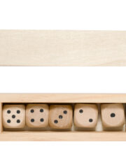 Jeu de dés élaboré en bois de finition naturelle. Cet ensemble comprend cinq dés à six faces, présentés dans un étui en bois avec couvercle coulissant. Personnalisations possibles :DIGITAL W1 (-5 cm2)